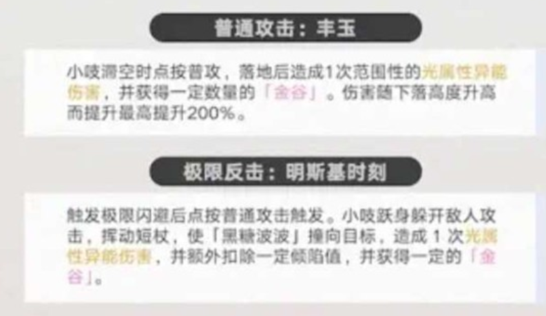 小吱在滞空状态下触发普攻,将自动释放“丰玉”技能:下坠过程中对大范围敌人造成光属性伤害,落地瞬间伤害倍率最高可达200%。该技能兼具清场效率与资源补充能力(命中即得金谷),是应对群怪场景的核心手段之一。
