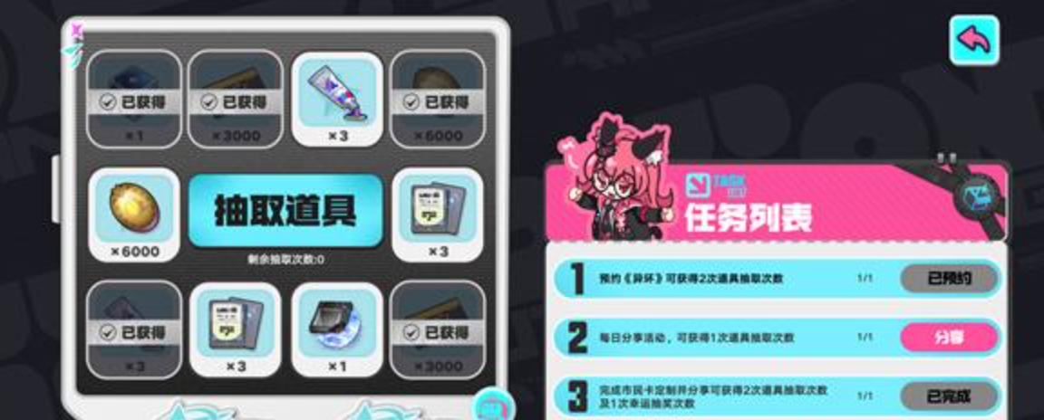 预抽卡功能位于《异环》官网指定商城页面,玩家可直接进入进行道具选购与抽取操作。同步开放的“市民卡定制”活动支持个性化身份卡生成与社交分享,首次成功分享即可获得2次基础抽卡机会及1次专属幸运抽奖资格。幸运抽奖池涵盖实体周边、PS5主机等高价值奖品;常规道具池则聚焦游戏内核心养成资源,包括抽卡代币、角色突破材料及武器类道具,助力玩家快速构建初始战力体系。