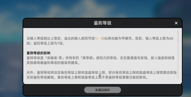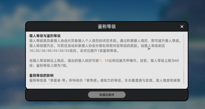 该系统由两大维度构成:猎人等级与鉴别等级。猎人等级即账号总等级,上限为60级;而鉴别等级则随猎人等级的提升而阶段性解锁——在猎人等级达到10、12、13、14、15、55、65级时,鉴别等级依次提升,最高可至7级。此等级不仅决定副本中敌人的强度与掉落品质,更直接制约角色等级上限:当鉴别等级为1时,角色最高等级锁定在40级;需升至鉴别等级2,方可开放50级上限;后续每提升一级鉴别等级,均对应更高阶的角色等级开放节点。