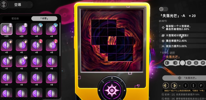空幕系统作为装备核心模块,由驱动块与卡带协同运作。卡带分为A类与B类两种,仅当A+B组合时,方可激活套装效果:二件套或四件套;亦支持2+2混搭方案。当前版本中,优先集齐四件套可获得更优综合收益。卡带主属性随机生成,光系角色推荐选择“光系异能伤害加成”为主属性;副属性则需匹配对应型号驱动块装配,以高效强化攻击、暴击等关键数值。此外,队伍配置需兼顾六种基础属性间的相生关系——相邻属性组合可触发特定协同效果,形成策略性克制链。