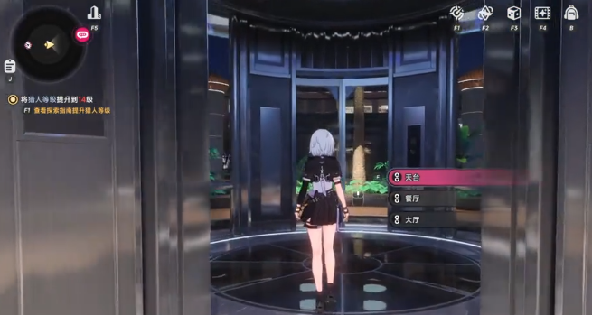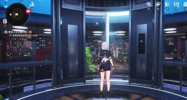 旅程始于一座垂直观景塔的底层电梯口。踏入轿厢瞬间,柔和女声广播悄然响起,提示乘客即将升抵上行塔顶层——此处是全城视野最开阔的观景点之一。当电梯平稳上升,镜头随角色视角同步抬升,脚下楼宇渐次铺展,灯火由点及面亮起,错落天际线在玻璃幕墙外徐徐展开。这种仪式感十足的登高过程,与日常快节奏战斗形成鲜明对照,让玩家自然进入松弛状态。