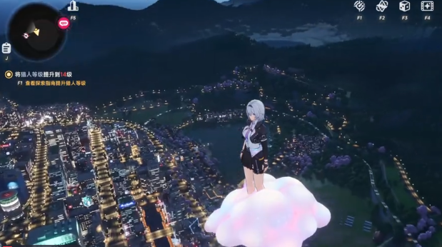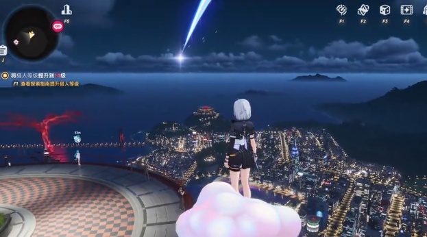 抵达塔顶平台后,沿环形步道缓行两周,即可发现悬浮于边缘的白色筋斗云。无需复杂交互,靠近即自动触发搭乘判定。踏上云团刹那,触感反馈轻盈绵软,随后云体开始沿预设轨迹平滑前移。此时镜头拉升,整座城市的三维轮廓尽收眼底:主干道如光带蜿蜒,地标建筑在夜色中泛着微光,远处天际线柔和过渡。飞行途中偶有流星划过视域上方,为这段无目标漫游增添一丝诗意伏笔。