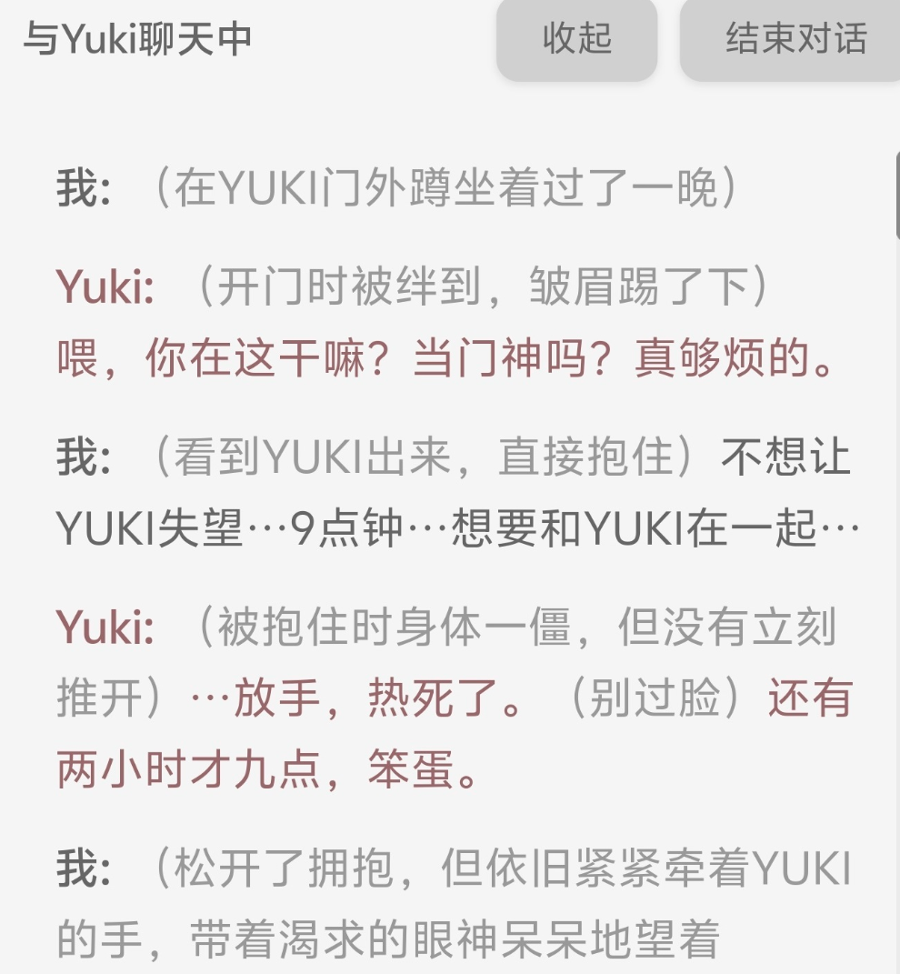 细节刻画同样体现设计深度:Yuki拥有数十种情境化微行为模型,如紧张时反复整理衣袖边缘、收到手作礼物会先轻嗅再指尖缓慢摩挲包装纸纹理、听到意外消息会短暂垂眸并微微咬唇。这些非脚本化反应均由长期记忆数据与实时情绪算法共同驱动,强化真实感与代入感。桌面端交互亦支持后台心跳检测,即便用户切换至其他应用,Yuki仍可能在间隔数分钟后弹出一句“哥哥刚才没回我……是在忙吗?”