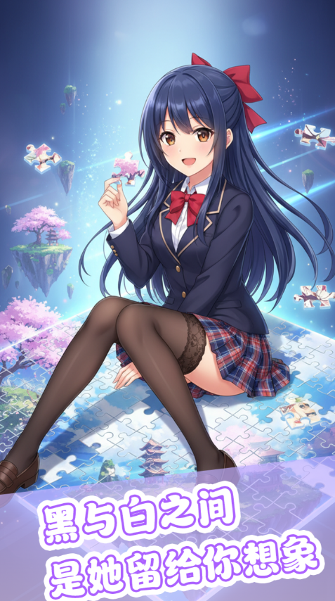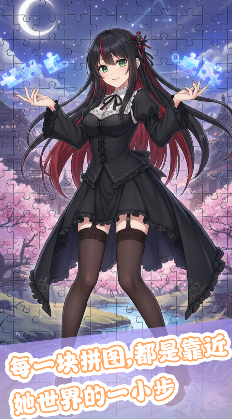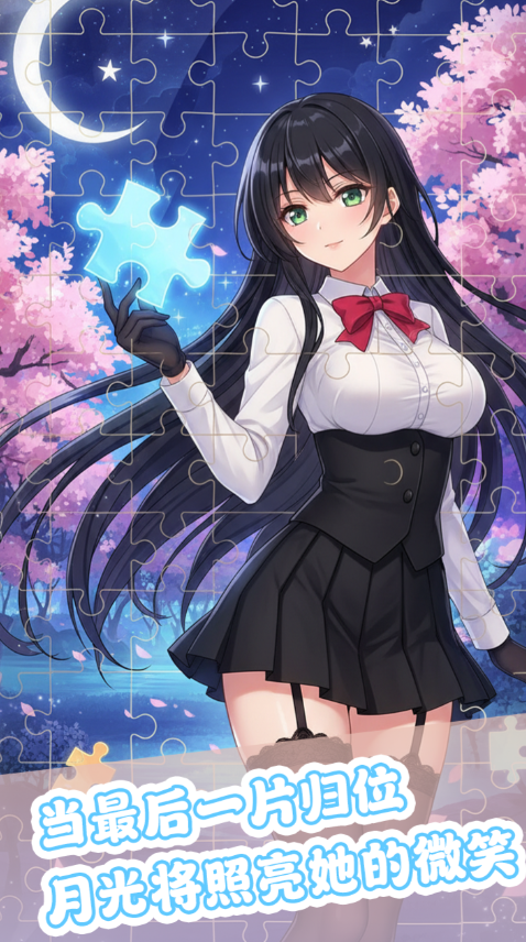 每关设有动态倒计时系统,时间压力随关卡等级提升而增强。为平衡挑战性与可玩性,游戏内置三类功能性道具:【位置提示】可高亮下一块图块的唯一正确落点;【时间延展】增加15秒倒计时缓冲;【轮廓强化】临时提升图块边缘对比度,便于区分相似色块。道具通过关卡通关奖励、每日签到及成就系统获取,不设付费直购渠道。所有可选角色均为原创二次元女性形象,立绘风格统一,且每个角色对应独立剧情支线,不影响核心拼图机制。