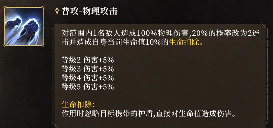 普通攻击虽仅对目标造成100%物理伤害,但存在20%概率触发二段追击,同时消耗当前生命值的10%。需特别注意:该生命扣除不可被护盾抵消,属于直接结算类型。因此,连续触发可能引发生存风险;但反向利用此机制,可高效激活被动护盾,形成“以血换盾”的战术循环。