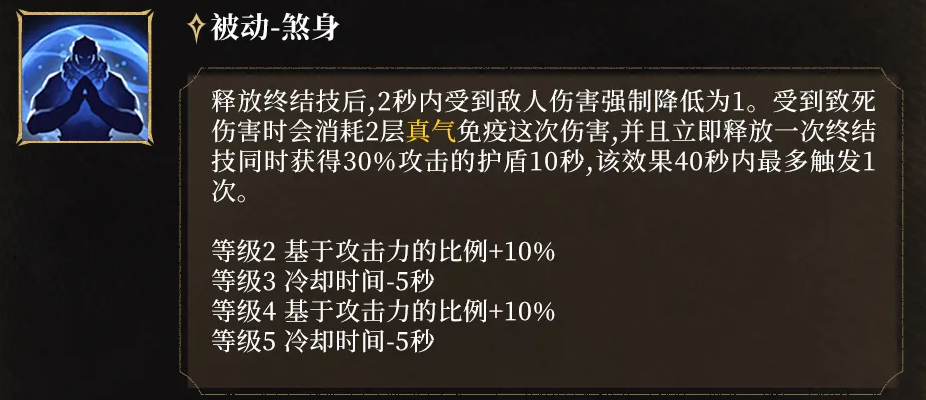 另一被动【煞身】赋予关键容错能力:终结技释放后的2秒内,所受伤害强制降至1点;更关键的是,当遭遇致死伤害时(即伤害值≥当前生命值),若真气≥2层,则自动消耗2层真气免疫本次伤害,并立刻释放一次【碎乾坤】,同时附加相当于攻击力30%的护盾。该效果每40秒最多触发一次,是团战切入与反打的核心保底机制。