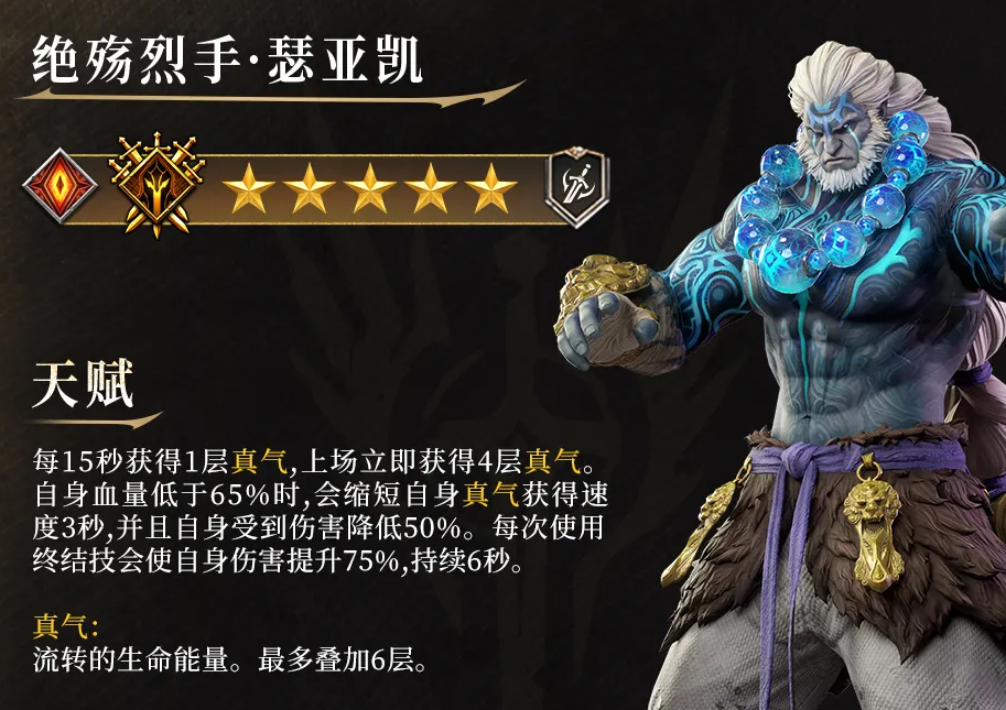 真气是瑟亚凯整套体系的运转中枢。基础状态下,每15秒自动获得1层真气,上限为6层;当自身生命值低于65%时,获取间隔缩短至12秒,并同步激活50%减伤效果。这一设计使他在中低血量阶段反而具备更强的持续作战能力。此外,每次释放终结技可触发“碎乾坤”增益——全属性伤害提升75%,持续6秒。该效果不可叠加,但可刷新持续时间,是衔接多段爆发的关键节点。