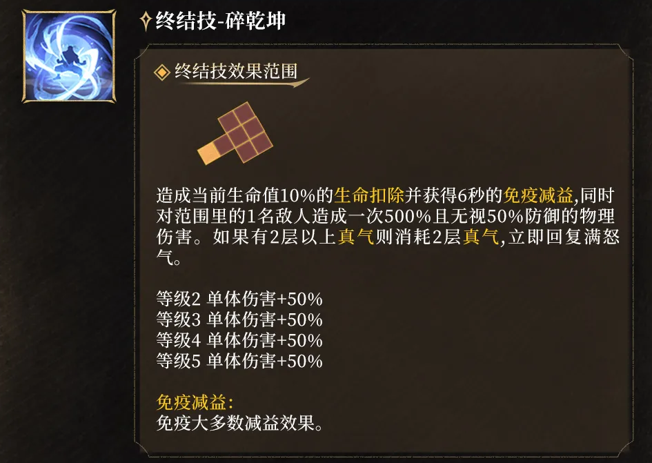 终结技“碎乾坤”是其核心输出手段。施放时首先扣除10%当前生命值,随即获得6秒免疫减益状态,并对目标造成500%物理伤害,且无视目标50%防御。若此时拥有≥2层真气,则自动消耗2层并立即回满怒气。该机制构成“真气→怒气→再释放”的闭环,是实现连续爆发输出的基础逻辑。合理规划真气层数,即可在单次战斗中完成多次终结技轮转。