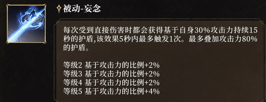 被动“妄念”提供稳定生存支撑。每次受到伤害后,生成相当于30%攻击力的护盾,持续15秒;同一目标5秒内仅生效一次。护盾可叠加,最高达攻击力的80%。该数值随攻击力成长而同步提升,意味着输出养成与生存能力呈正相关,无需额外堆叠生存属性即可获得可观容错空间。