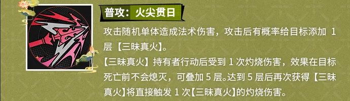 基础普攻“火尖贯日”为单体目标施加【三昧真火】状态,每命中一次叠加1层,最高可至5层。该减益效果具有强持续性:目标每次行动均会触发灼烧伤害,且不会随时间衰减,仅在其阵亡时自动清除。叠满5层后,后续任何触发均可额外结算一次固定伤害。因此,哪吒的速度属性直接影响其Debuff覆盖率与节奏掌控力,是构建其输出循环的关键维度。