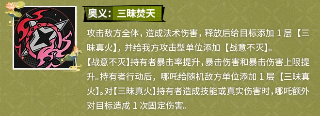 奥义技“三昧焚天”为全体敌方单位施加1层【三昧真火】,并为己方所有攻击型角色赋予【战意不灭】增益。该增益同步提升暴击率、暴击伤害及暴击伤害上限。当携带【战意不灭】的队友完成一次行动后,哪吒将自动对随机一名敌人追加1层【三昧真火】。此外,若哪吒使用技能伤害或真实伤害命中已带有【三昧真火】的目标,则额外触发一次固定数值伤害。这一联动机制显著放大了其协同输出能力,尤其在多段攻击或高频行动阵容中表现突出。