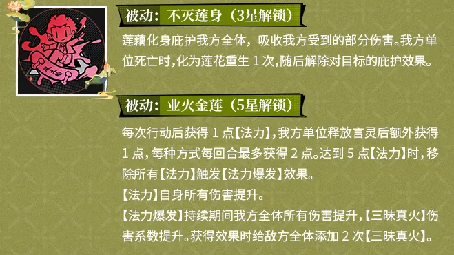 3星解锁被动“不灭莲身”,可为全队施加吸收伤害的护盾。当任意友方单位阵亡时,该技能将激活一次重生效果,令其立即复活并恢复一定生命值,随后护盾效果解除。该机制大幅提升了队伍在高压副本中的生存容错空间,但需注意:重生效果每场战斗仅可触发一次,不可重复生效,需合理规划站位与承伤节奏。