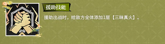 5星被动“业火金莲”构成哪吒的核心爆发逻辑:每次自身行动获得1点法力;当队友释放言灵技能时,额外获得1点法力(每种获取方式每回合最多计入2点)。累计积攒5点法力后,触发【法力爆发】状态:期间全队造成的伤害提升,同时【三昧真火】的灼烧系数提高。爆发启动瞬间,还将为全体敌人追加2层【三昧真火】,与奥义技形成高效层数衔接。援助技能则在登场时即对敌方全体施加1层【三昧真火】,实现开局快速铺垫,为后续多段伤害打下坚实基础。