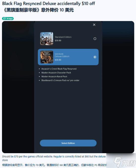 海外r/playstation社区曝出价格异常问题,《刺客信条:黑旗 记忆重置》在PS商店出现标价失误。游戏官网标定豪华版原价70美元,平台普通版稳定售价60美元,出错的豪华版临时同价售卖,直接便宜10美元。