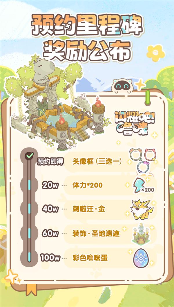 为了回馈玩家对游戏的关注与热忱,《闪耀吧!噜咪》对全平台预约奖励进行了升级:预约即得: 头像框(3选1),达成「20万预约」可解锁:体力*200,达成「40万预约」可解锁:刺啦汪 · 金,达成「60万预约」可解锁:装饰建筑 · 圣地遗迹,达成「100万预约」可解锁:彩色噜咪蛋。预约数达成后,将在游戏正式公测后进行发放,且以最终下载游戏包体的平台奖励为准,每个账号仅可领取一次。