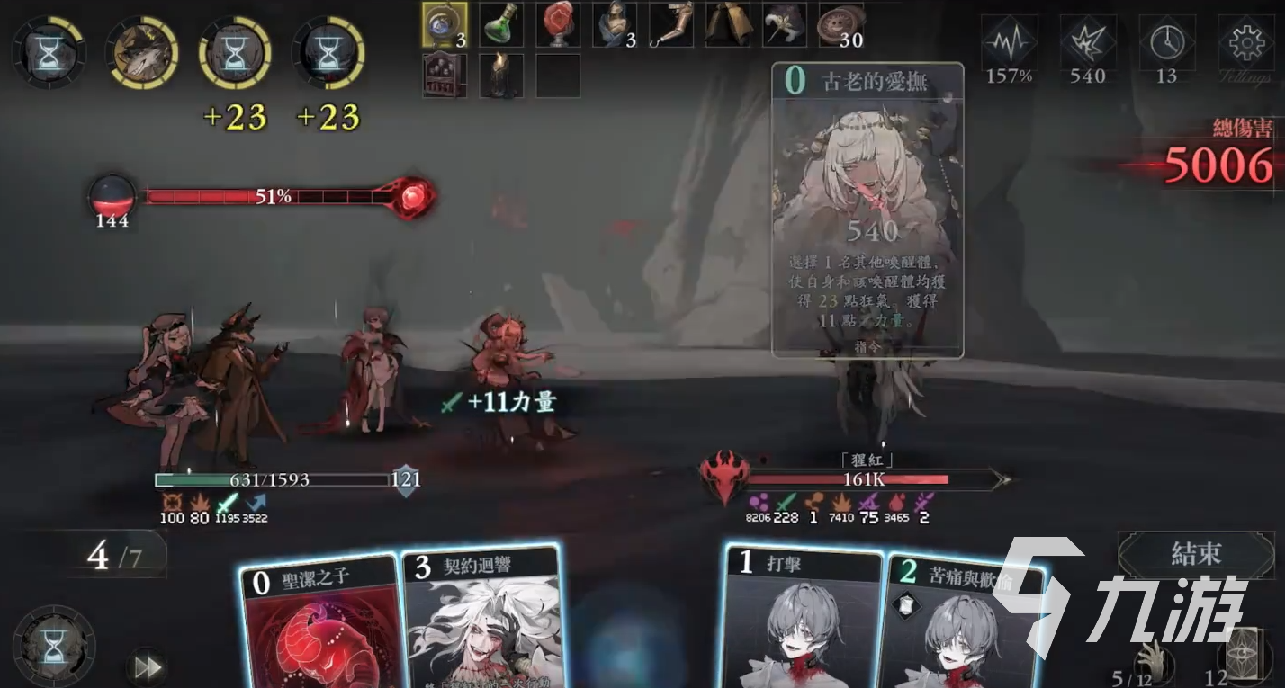 打击卡造成攻击力10%点伤害,自己获得5点狂气;防御卡可获得防御力10%点的护盾,同时也能拥有5点狂气;灵智觉醒可获得25点狂气,在她打出卡牌后,胚胎融合进度提升15%。