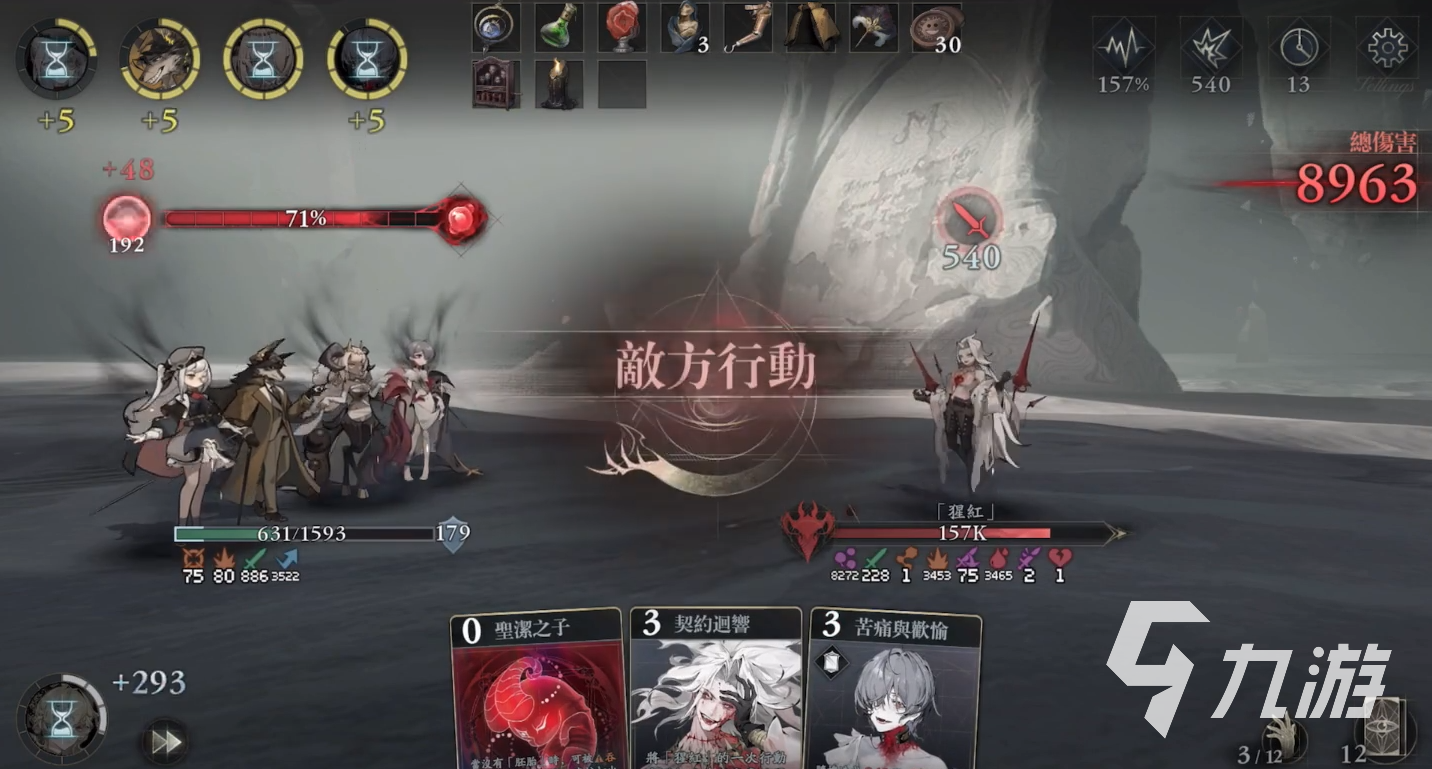 技能2释放后,随机造成攻击力30%点伤害,且攻击次数为3次,直到下个回合开始之前,每损失2点生命,下一轮开始就获得1点护盾;通过3次频繁攻击,辅助补充伤害。