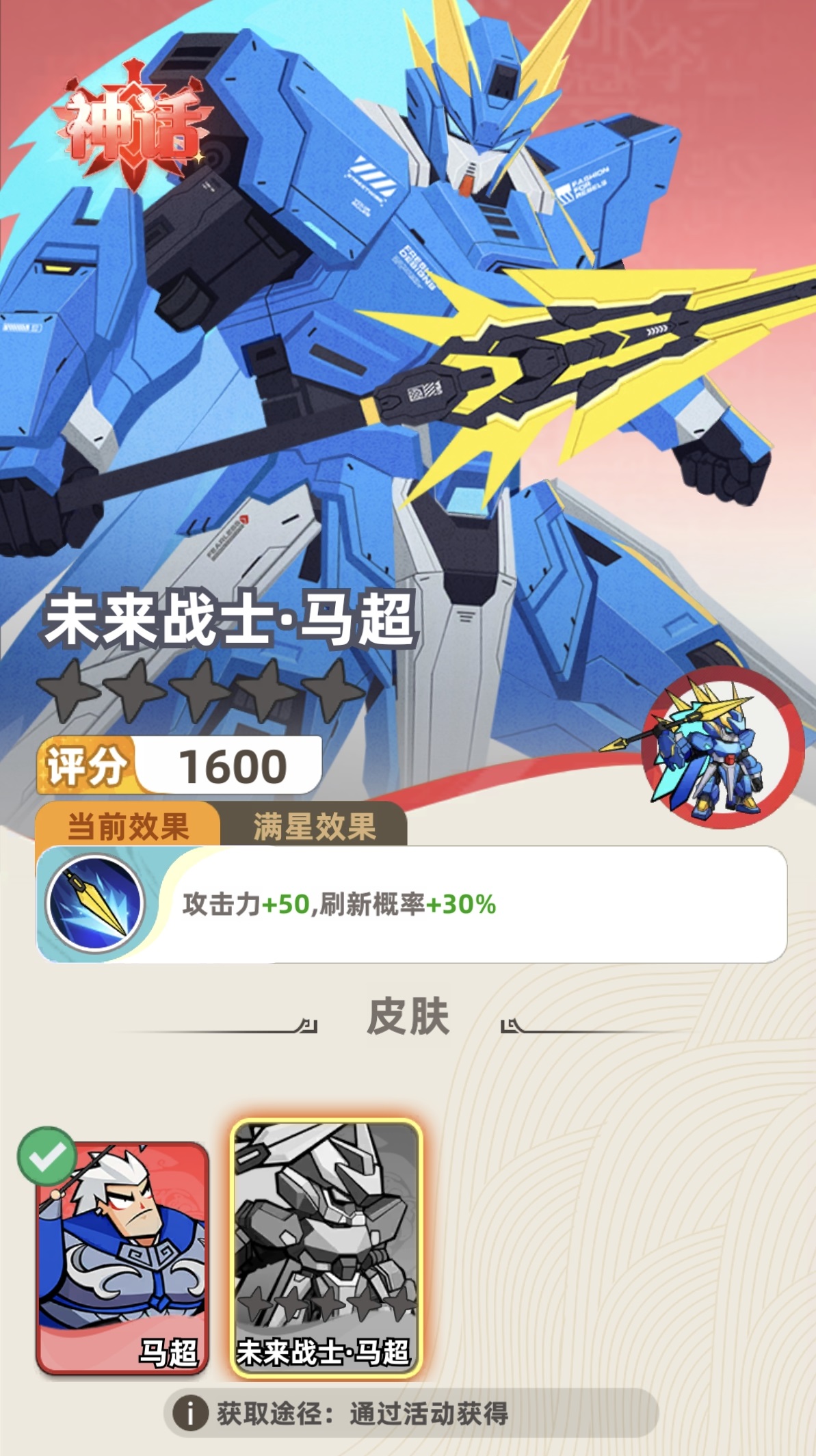 该皮肤具备双重价值:视觉表现采用科幻机甲风格,同时提供实质性战力加成。当皮肤升至满星(五星)时,固定提升90点基础攻击力,并额外增加35%武将刷新概率。由于《王者之弈》中武将登场完全依赖随机刷新机制,此项属性可显著提高马超在单局内快速成型的概率,从而强化阵容启动速度与中期压制力,这也是其成为高阶玩家首选皮肤的关键原因。