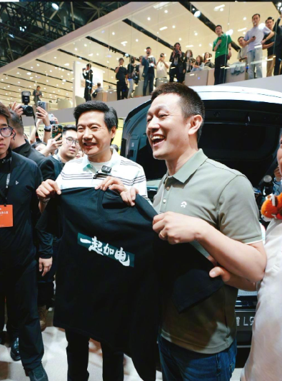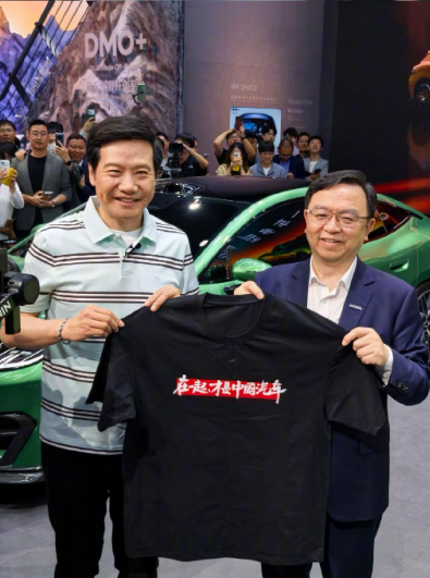 在比亚迪展台,雷军与比亚迪总裁王传福亲切握手、深入交流,同时向其赠送印有 “在一起才是中国汽车” 字样的定制 T 恤,以此传递国产车企携手共进、抱团发展的理念。