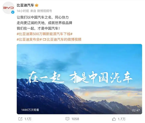 据了解,“在一起,才是中国汽车” 这句口号,最早源自2023年8月9日比亚迪第 500 万辆新能源汽车下线仪式。