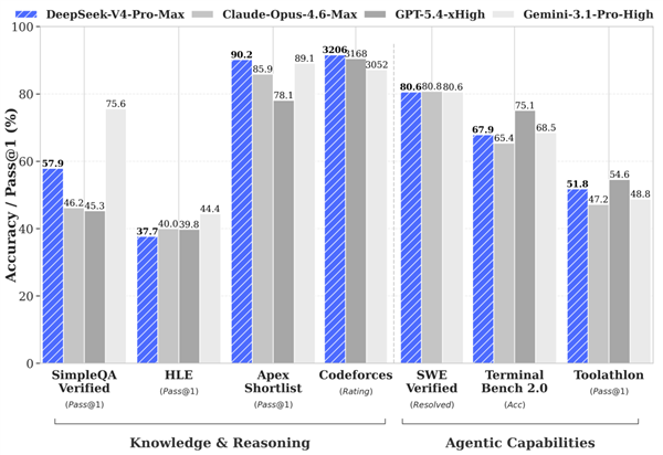 V4 Pro 能和 Claude Opus 4.6、GPT 5.4、Gemini 3.1 Pro 这些闭源顶尖模型打个五五开。