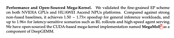 在底层和显卡的适配优化上也下了一大堆功夫,在英伟达和华为的卡上都测试了自己做的 fine-grained EP,能让模型的推理速度提升 1.50 到 1.73 倍。