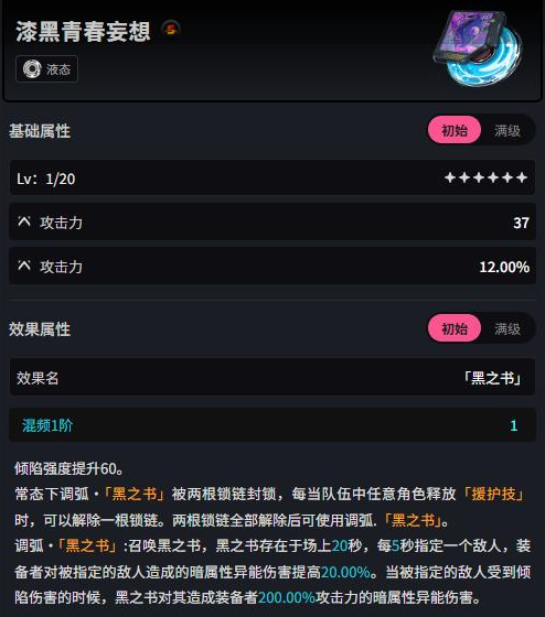 第二个就是漆黑青春的妄想,走的是双攻击力基础路线。纯输出属性还是比较出色,1级初始攻击力同样是37,满级攻击力就可以获得12%加成。如果你追求极致的伤害,那么就可以关注一下,它的核心就是围绕黑之书展开。可以大幅度的强化伤害,在常态下黑之书就会直接被封锁,队伍中任意角色在释放援护技能时就可以直接解除一根。激活再场20秒,每5秒就会锁定一个敌人,装备者也可以迅速的提升暗属性伤害。
