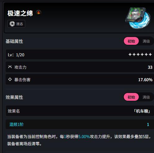 第三个就是极速之棉,基础属性就是攻击力搭配暴击伤害,精准瞄准暴击流输出角色之后就能弥补一部分角色暴击伤害不足的短板。它会延续属性灵活的优势,基础属性成长线性稳定,在满级之后就可以给角色提供可观的输出加成。无论是速攻流还是爆发流,角色在装备之后都能迅速的提升伤害的上限。整体来看,其实这几个各有各的优势,例如最后的一朵玫瑰就很适合持续性伤害。