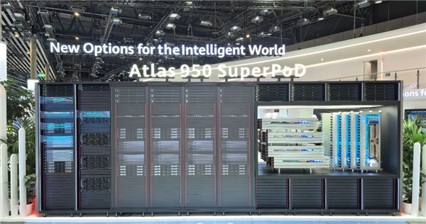 而国产芯片们想要堆出近似算力,就需要拿出更多的芯片。所以去年华为昇腾拿出了 384 超节点,通过 12 个机柜,每个机柜 32 张卡,硬是堆出 300 PFLOPs 算力,接近 NVL72 的两倍了。而今年差评更是在 MWC 现场看到了华为最新的 Atlas 950,也就是 8192 卡互联的超节点。