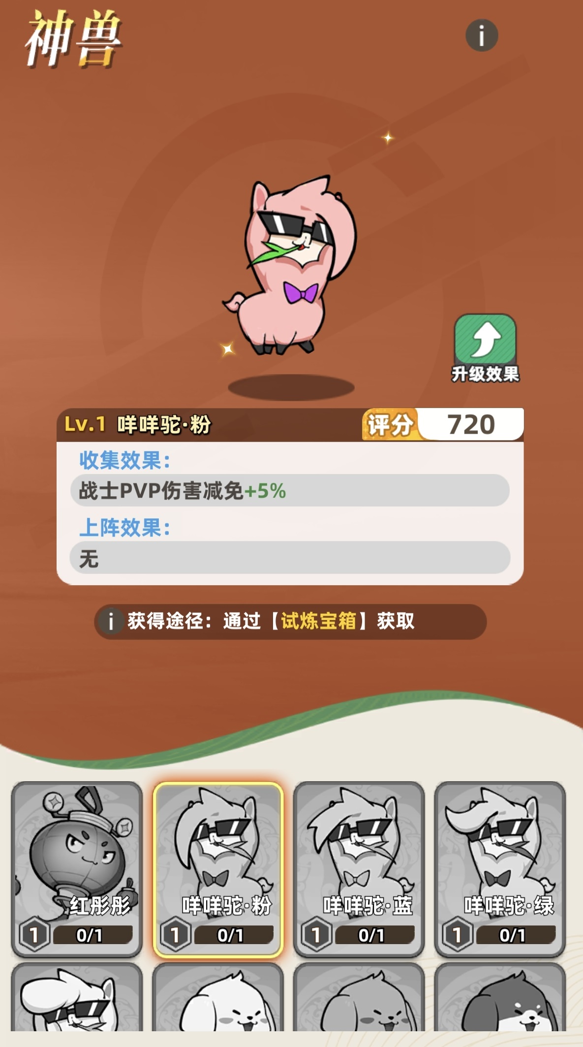 当前版本共上线十种神兽,获取途径各不相同: 第一,凤凰——通过赛季排行榜活动获取,上阵后为全体单位提升5%攻击力,特别适配高爆发输出体系,如刺客流、射手流; 第二,神马浮云——限时活动产出,提供全体20%生命值加成,适用于强调续航能力的战士阵容或持久战流派; 第三,小毛球——通关无尽挑战副本解锁,激活后全体获得450点固定生命值,是生存向阵容的重要基石; 第四,红彤彤——活动兑换获得,战斗中额外增加银两收入,功能性较弱,优先级较低; 第五,咩咩驼——含粉、蓝、绿、白四种品质,开启试炼宝箱随机获取,属收集效果,按品质分别对应战士、射手、刺客、谋士职业,提供对应职业PVP场景下的物理伤害减免; 第六,萌萌汪——同样分多色品质,通过试炼宝箱获取,为收集效果,针对各职业提供PVP伤害加成; 第七,不良兔——每日超级礼包内概率获取,上阵后单体增加300点基础生命值; 第八,凌霄鲲——参与野区寻宝玩法获得,上阵后全体单位获得6%法术伤害减免; 第九,白泽——试炼转盘活动专属,上阵后全体单位获得6%PVE物理伤害减免; 第十,心愿兔——首充礼包限定,获胜后额外获得六星奖励。