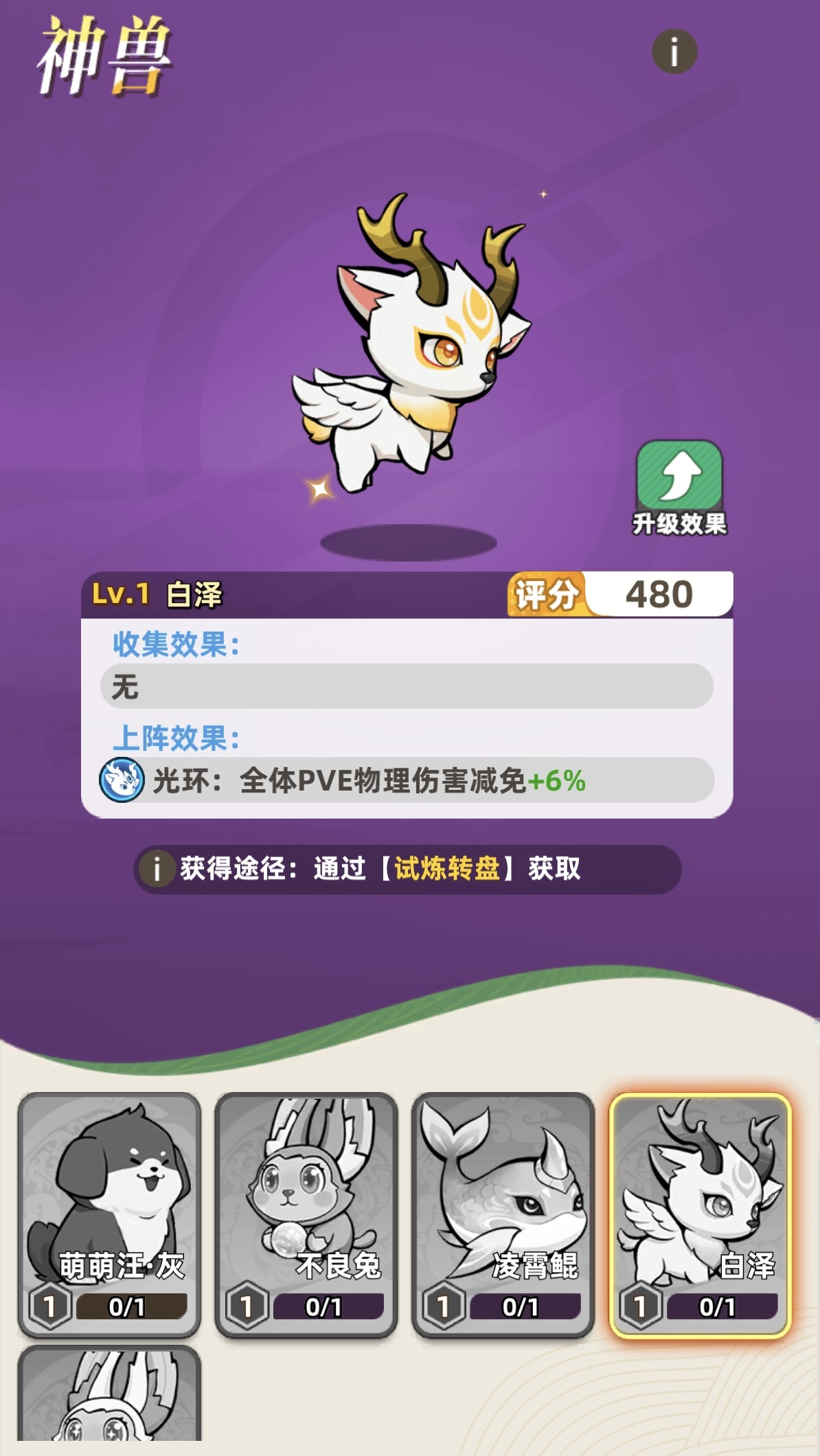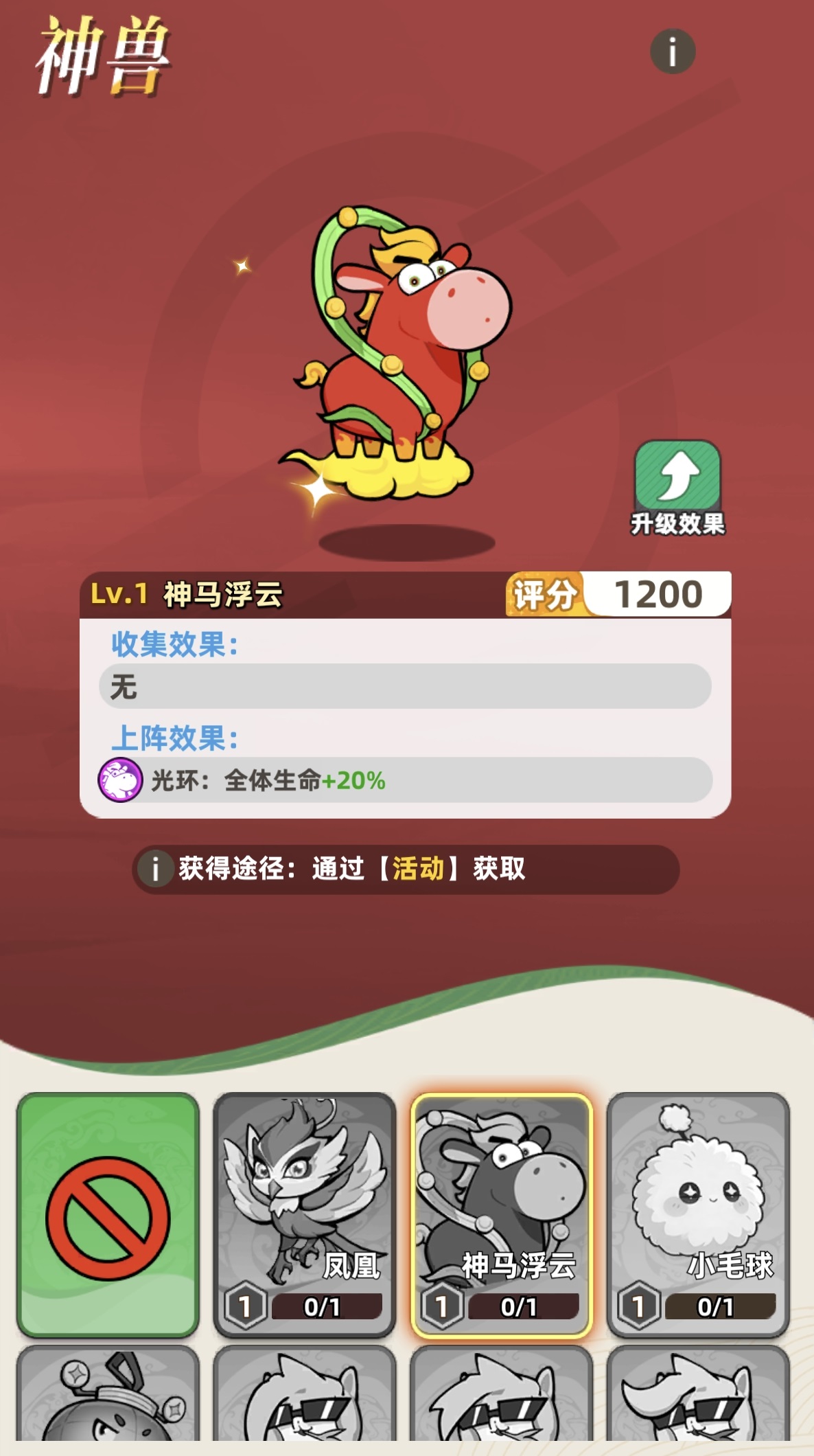神兽效果分为两大机制:收集效果与上阵效果。收集效果在神兽被激活后即时生效,无需编入战斗阵容,且支持多只叠加,因此激活数量越多,基础属性增益越显著;上阵效果则需将神兽主动部署至出战位才触发,属于战术级选择。所有神兽均可通过消耗资源升级,从而提升对应属性加成数值。