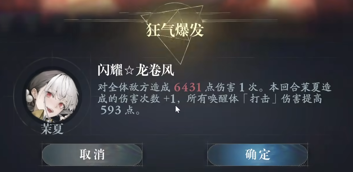 茉夏的核心资源为“狂气”,初始通过“狂气爆发”对全体敌人造成伤害,并使本回合所有唤醒体的打击伤害提升;其被动“雾境遗脉”可稳定获取25点狂气;觉醒效果“戏剧性邂逅”可使该技能的触发次数+2,且每次触发时,茉夏所使用的打击卡临时最终伤害提升25%。