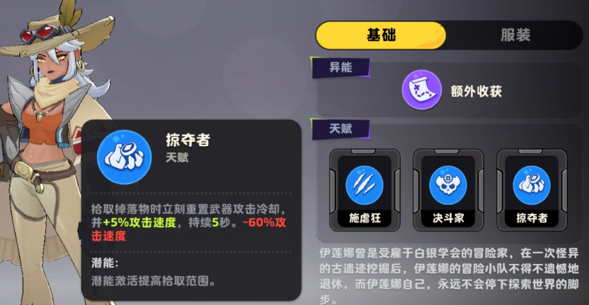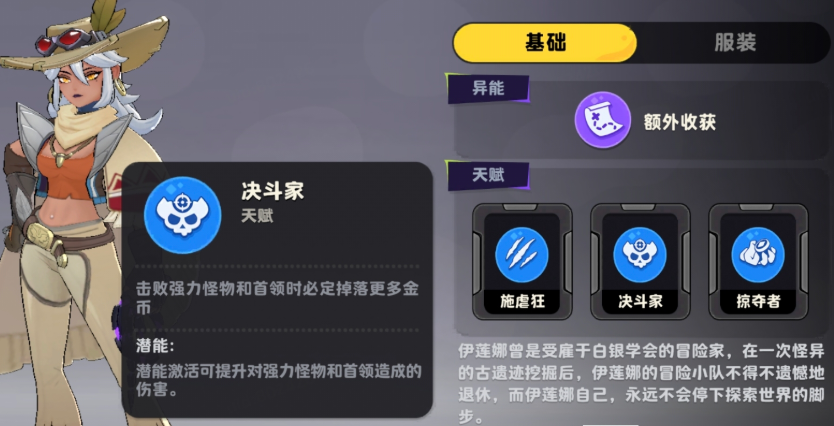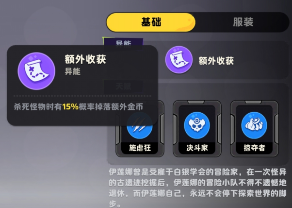 需特别注意:伊莲娜经历多次平衡性调整,当前版本能力体系已与初始设计存在显著差异。现阶段她的异能触发高度依赖外部条件——即通过击杀敌人被动激活效果。其中一项关键被动为“金币增益”:每次击杀怪物时,有15%概率额外掉落金币。该机制直接强化了中后期资源积累效率,为武器合成、商店刷新及多武器流派构筑提供稳定经济支撑。