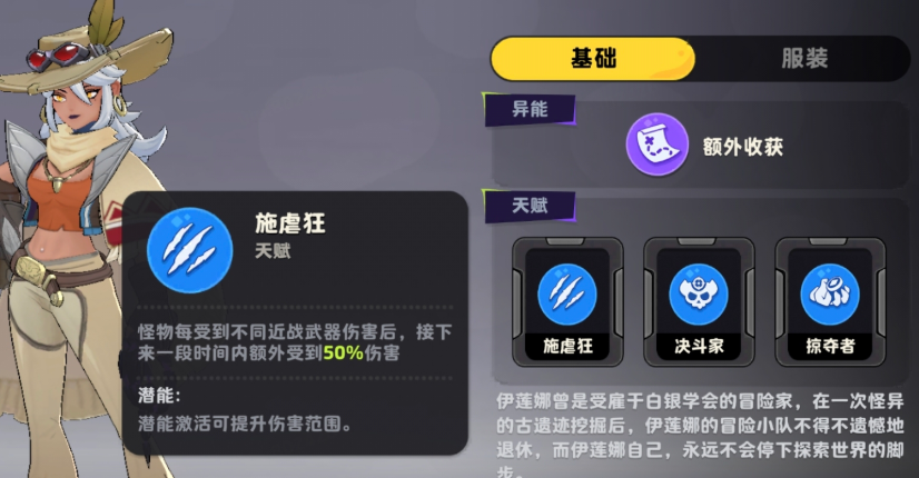 前期推荐天赋为【施虐狂】。该天赋使伊莲娜在使用任意近战武器造成伤害后,获得持续数秒的50%伤害加成;若激活对应潜能,还可同步扩大攻击范围。该效果不绑定武器品质,而与所持近战武器种类数量正相关——即携带的近战武器类型越丰富,叠加增益越显著。因此前期升级策略应聚焦于“广度”而非“深度”:优先合成多种低阶近战武器(如匕首、短剑、链锤等),快速堆叠伤害增幅,其实际收益远超单一高阶武器带来的数值提升。