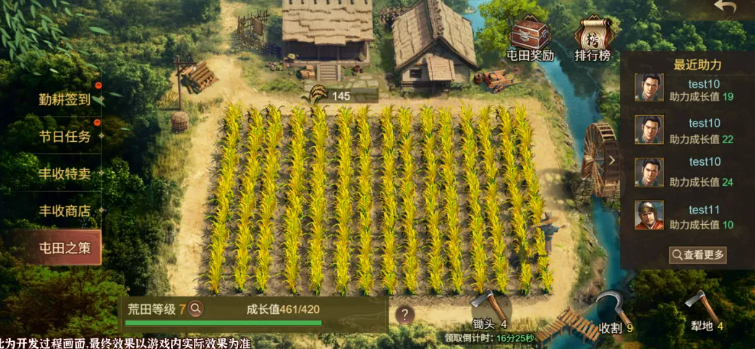 本玩法特别加入协作机制:主公可前往好友的荒田协助开垦。每次助耕双方均能获得成长值,实现双向增益。但每日助耕上限为3次,助耕累计最多可获10个粳稻;而自身操作(犁地+收割)每日粳稻获取上限为20个。建议优先完成自身额度,再合理分配助耕次数,以最大化粳稻收益。