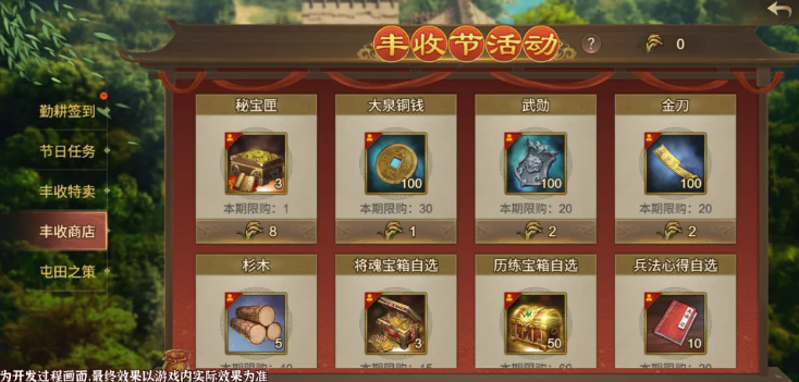 “丰收商店”为本次活动资源转化终端。粳稻作为唯一通用兑换货币,来源覆盖三大模块:勤耕签到、屯田之策、节日任务。商店内上架多项高价值物品,包括限定宝物【断铠双刀】、大泉铜钱、金刀、武勋、玉符等。其中【断铠双刀】为稀缺性道具,建议有需求的玩家优先储备粳稻,确保兑换资格。