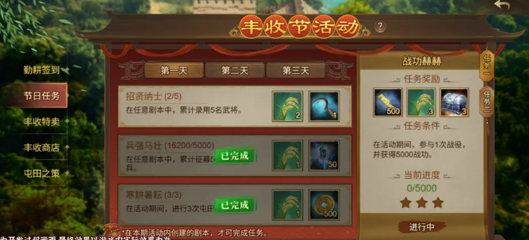 “节日任务”采用分阶段开放机制。活动开启后前三日,每日解锁3个基础任务,完成后可领取大泉铜钱、粳稻等奖励;活动后期将追加2个高难度特殊任务,对应更丰厚的资源回报。需特别注意:仅在活动开启后新建的剧本中完成的任务方可计入进度,已存档剧本不参与统计,请玩家在启动任务前确认剧本创建时间。