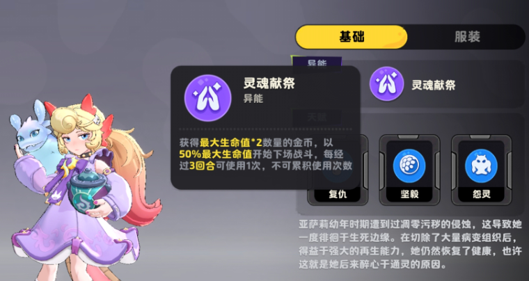 亚萨莉的实战强度与战局节奏深度绑定:连败次数越多,其经济收益越可观。核心机制之一是“灵魂献祭”天赋——每次激活异能时,可获得相当于最大生命值2%的金币;每3回合还可额外触发一次该效果(不可叠加),为中后期装备成型提供稳定资源支撑。这一设计使其在资源积累阶段具备显著优势,尤其适配长线运营流派。