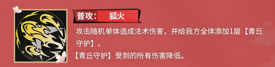 先说说九月的普攻狐火,这个技能打出去,是对随机单个敌人造成法术伤害,伤害本身不算特别高,但重点在于,会给我方全体添加一层青丘守护。这个青丘守护的效果,就是降低受到的所有伤害,虽然单层的减伤幅度,不算太夸张,但是可以叠加的,多打几次普攻,就能把层数堆上去。在一些持久战,或者敌人输出比较猛的关卡里,这个减伤效果,还是挺有用的,能让队伍的生存能力提升不少。