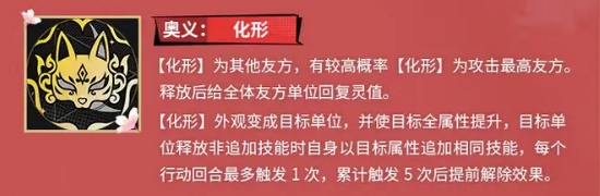 九月的奥义化形,是她最核心的技能,释放之后,她会变成队友的外观,通常情况下,会优先变成攻击属性最高的那个队友。变身之后不仅外观改变了,还会让目标队友的全属性得到提升,这个提升幅度还算可以。更主要的是,当目标队友释放非追加技能的时候,九月会以目标的属性,追加释放相同的技能,等于是把队友的技能,又打了一遍。不过这个追加效果,每个行动回合,只能触发一次,而且累计触发五次之后,化形状态就会提前结束。所以在使用的时候要注意,不要浪费这个追加次数,尽量让队友释放一些高价值的技能,来触发追加效果。另外化形释放的时候,还会给全体队友回复灵值,这个回复量虽然不算特别多,但在重要时刻,能帮队友更快放出技能。