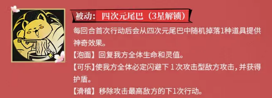 九月的第一个被动技能,叫四次元尾巴,这个技能,需要升到三星才能解锁。效果是每回合首次行动之后,会随机掉落一种道具,有三种可能。第一种是泡面,能回复我方全体的生命和灵值,这个在队伍缺奶的时候,比较有用。第二种是可乐,效果是让我方全体必定闪避,下一次敌方的攻击型攻击,同时还会获得护盾,这个在应对敌人大招的时候,特别好用。第三种是滑稽,能移除攻击,最高敌方的下一次行动,相当于让敌人少打一次,在某些情况下,可以打乱敌6的随机性比较强,有时候能掉出来,正好需要的道具,有时候可能就没那么合适,但总体来说,还是增加了九月的实用性。