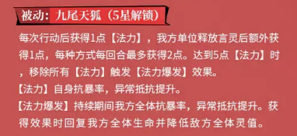 第二个被动技能九尾天狐,要升到五星才能解锁,这个技能的机制,稍微复杂一点。九月每次行动之后,会获得一点法力,如果我方单位释放言灵技能的话,她还能额外获得一点,不过每种方式,每回合最多只能获得两点。当法力积累到五点的时候,就会触发法力爆发效果,同时移除所有法力,重新开始积累。在积累法力的过程中,九月自身的抗暴率,和异常抵抗会得到提升,法力点数越多提升越明显。
