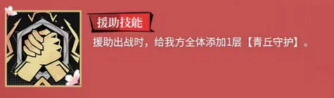 九月的援助技能比较简单,当她作为援助角色出战的时候,会给我方全体添加一层青丘守护。虽然只是一层,但在战斗开始的时候,就能提供一定的保护,算是一个不错的开场增益。