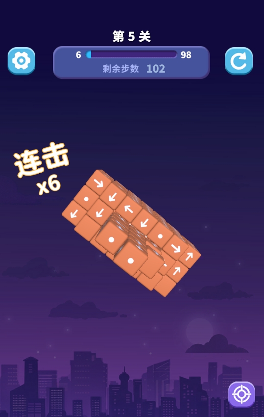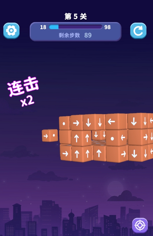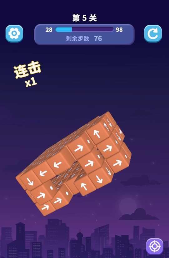 不过,在消除正方体的过程中,若是正方体箭头所指的方向刚好有障碍物遮挡,那被点到的正方体只能被迫留在原地无法动弹,唯有将它前方的障碍物全部清理掉,才能令它完成消除。再加上每道关卡都有步数限制,若玩家无法在规定的最大步数内完成立体模型的消除,会被判定为闯关失败,只能重新再进行一次挑战。这也意味着游戏虽然在设计上没有太高的游玩门槛,但也有着极高的挑战乐趣,玩家们需看好各立方体能否进行消除,再进行点击,不要白白浪费掉了步数。