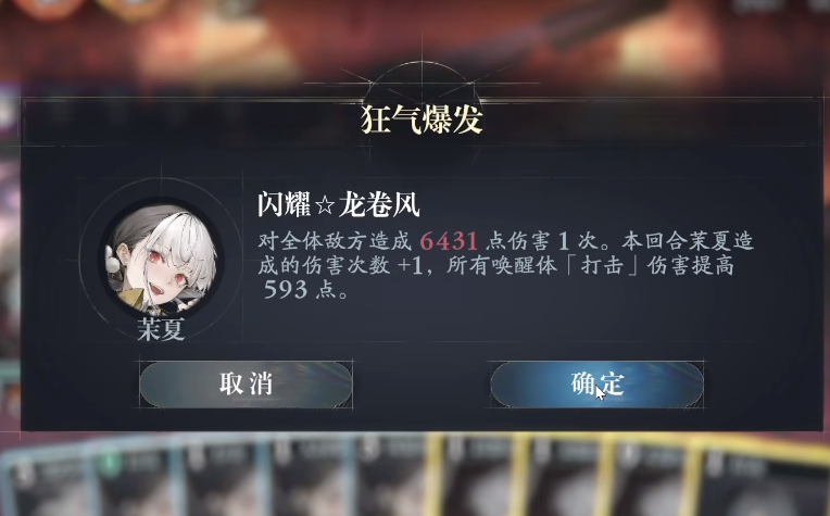卡组机制构成茉夏的核心战斗逻辑。常规打击卡造成30点固定伤害并为自身积累10点狂气;防御卡提供26点护盾值并同步获取10点狂气;指令卡“风暴冲击”可对随机单一目标发动五次独立判定,每次造成90点伤害,并额外获得30点狂气;指令卡“人间爆破”则覆盖全体敌方单位,造成45点基础伤害,随后强制触发“狂气爆发”效果;终极指令“闪耀龙卷风”对全体敌人造成745点高额伤害,同时使全队成员后续打出的每张打击卡附加373点固定伤害加成。