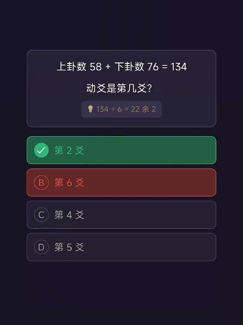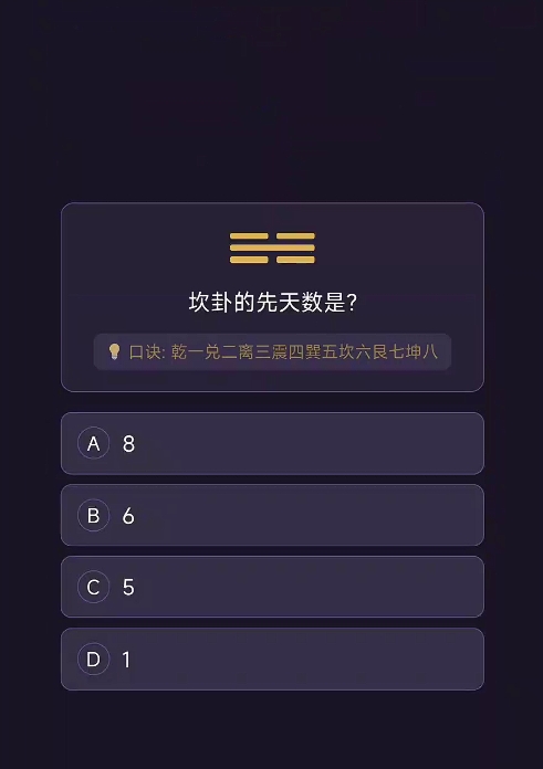 其中,“八卦认知”采用互动问答机制,系统随机呈现乾、坤、震、巽等八种基本卦象,要求玩家准确回答其先天数(如乾一、兑二)、五行属性、方位归属及象征意义等内容。答题结果实时统计正确率与累计答对题量,形成个人知识图谱;若出现误判,系统即时推送标准答案并附带原理说明,强化记忆锚点与逻辑闭环。