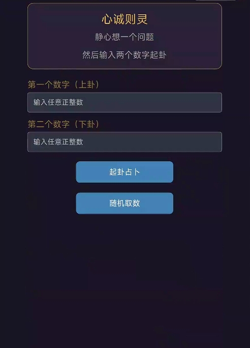 在“自由占卜”模块中,玩家可自主输入上卦与下卦对应的任意数字(亦支持一键随机生成),系统将依据梅花易数“年月日时+数理推演”规则,自动生成完整卦象、互卦、变卦,并同步输出每一步推演依据及最终断辞解析。该过程严格遵循传统起卦范式,既可用于验证所学,也适合作为日常思维训练工具,在轻松操作中深化对“动爻变化”“体用关系”“卦气旺衰”等核心概念的理解。