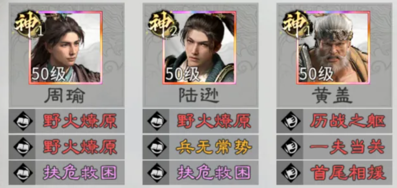 第二套推荐为「灼烧连锁流」:周瑜、陆逊、黄盖。该队以“风势+灼烧”双机制驱动,强调状态扩散与多段叠加伤害。周瑜作为主将,其天赋可对敌方全体施加风势,大幅缩短灼烧传播时间,使灼烧效果迅速覆盖全场;陆逊则需置于特定站位触发双重追击,配合天赋可高效叠灼,并对已处于灼烧状态的目标发动最多三次连锁伤害;黄盖提供初始灼烧与承伤转化能力。整套阵容养成成本低、成型快,且灼烧属持续伤害类型,不触发反击类被动,对反击队形成天然克制。但因缺乏治疗与续航手段,持久作战能力偏弱,更适合速战速决场景。