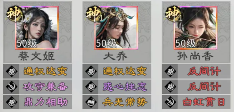 第三套为「追击暴击流」:蔡文姬、孙尚香、大乔。该阵容以高频普攻追击与暴击增益为核心,双辅助保障生存与增益覆盖率,孙尚香承担主要单体爆发任务。蔡文姬提供减伤、回血与怒气支援,大乔强化暴击率与追击概率,共同放大孙尚香的瞬时斩杀能力。该队泛用性强,从中前期过渡至后期无需大规模更换核心成员,长期培养价值突出。替代方案中,蔡文姬可由黄月英替换,后者在技能循环与辅助协同方面同样表现优异。需注意的是,孙尚香技能效果为随机单体伤害,在面对高群体抗性或具备定点爆发反制机制的对手时,节奏易被拖慢;但在多数常规对局中,其压制力与稳定性仍属上乘。