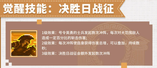 「决胜日战征」为领主核心觉醒技,采用“士兵协同突进”机制:每次释放可召唤士兵对前方扇形区域发动斩击,具备显著群伤能力;升至二阶后,每次冲锋将叠加“伤害总增”效果,持续数秒且可多次叠加;三阶进一步提升战术频率,单次技能可触发多轮连续冲锋,显著抬高单位时间内的爆发阈值。该技能不依赖复杂操作逻辑,重在节奏把控与技能衔接,配合圣魂可实现策略性增益跃迁。